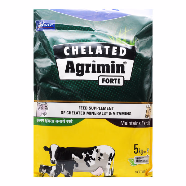 Chelated Agrimin Forte is a premium mineral and vitamin supplement from Virbac, formulated for cattle, buffaloes, and other large animals. It contains a balanced blend of chelated minerals and essential vitamins that support fertility, growth, milk production, and overall health. Thanks to its superior absorption and bioavailability, the supplement effectively meets the nutritional demands of livestock, improving reproductive performance, boosting milk yield and fat content, and promoting bone strength, muscle function, and metabolic balance. Free from Bacillus anthracis, clostridium spores, and visible moulds, Chelated Agrimin Forte is safe for daily use across all physiological stages. It also strengthens immunity, enhances coat condition, and supports overall vitality, making it a reliable choice for routine supplementation.