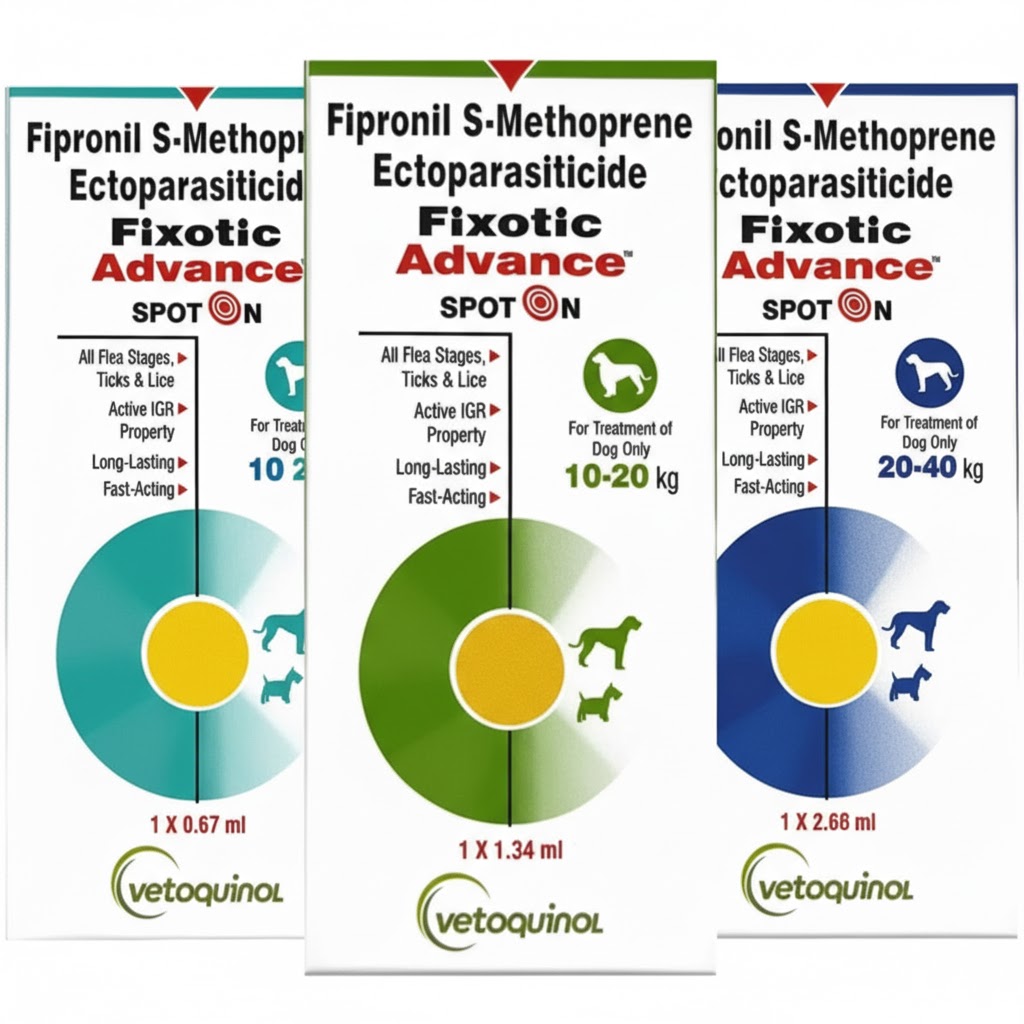 Fixotic advance spot on effectively controls all stages of flea, tick & lice infestations in dog. S-methoprene inhibits the development of pupae to adult. It has fast lipophilic action with long lasting protection.