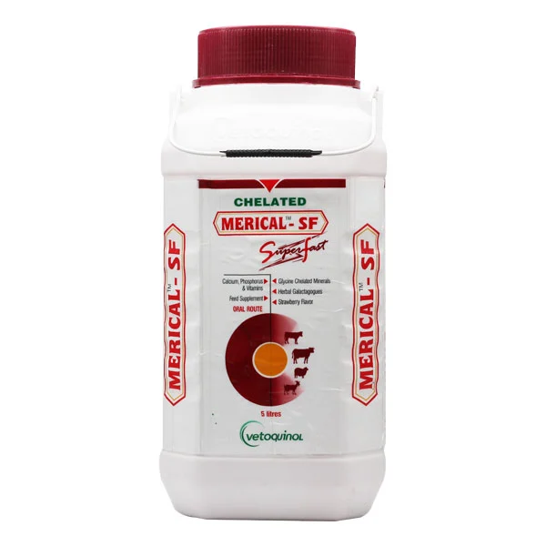Merical SF, Glycine Chelated liquid oral calcium supplement with strawberry falvour which improves milk production and Fat % . Merical SF contains Zinc, Copper, Manganese chelated with Glycine, which is smaller amino acid having lower molecular wt.