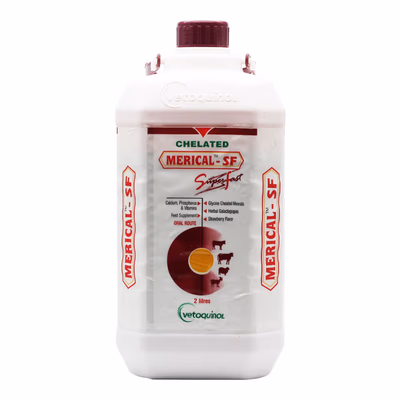 Merical SF, Glycine Chelated liquid oral calcium supplement with strawberry falvour which improves milk production and Fat % . Merical SF contains Zinc, Copper, Manganese chelated with Glycine, which is smaller amino acid having lower molecular wt.