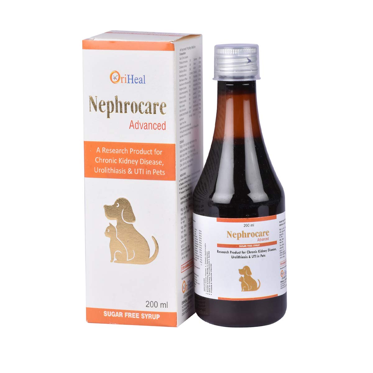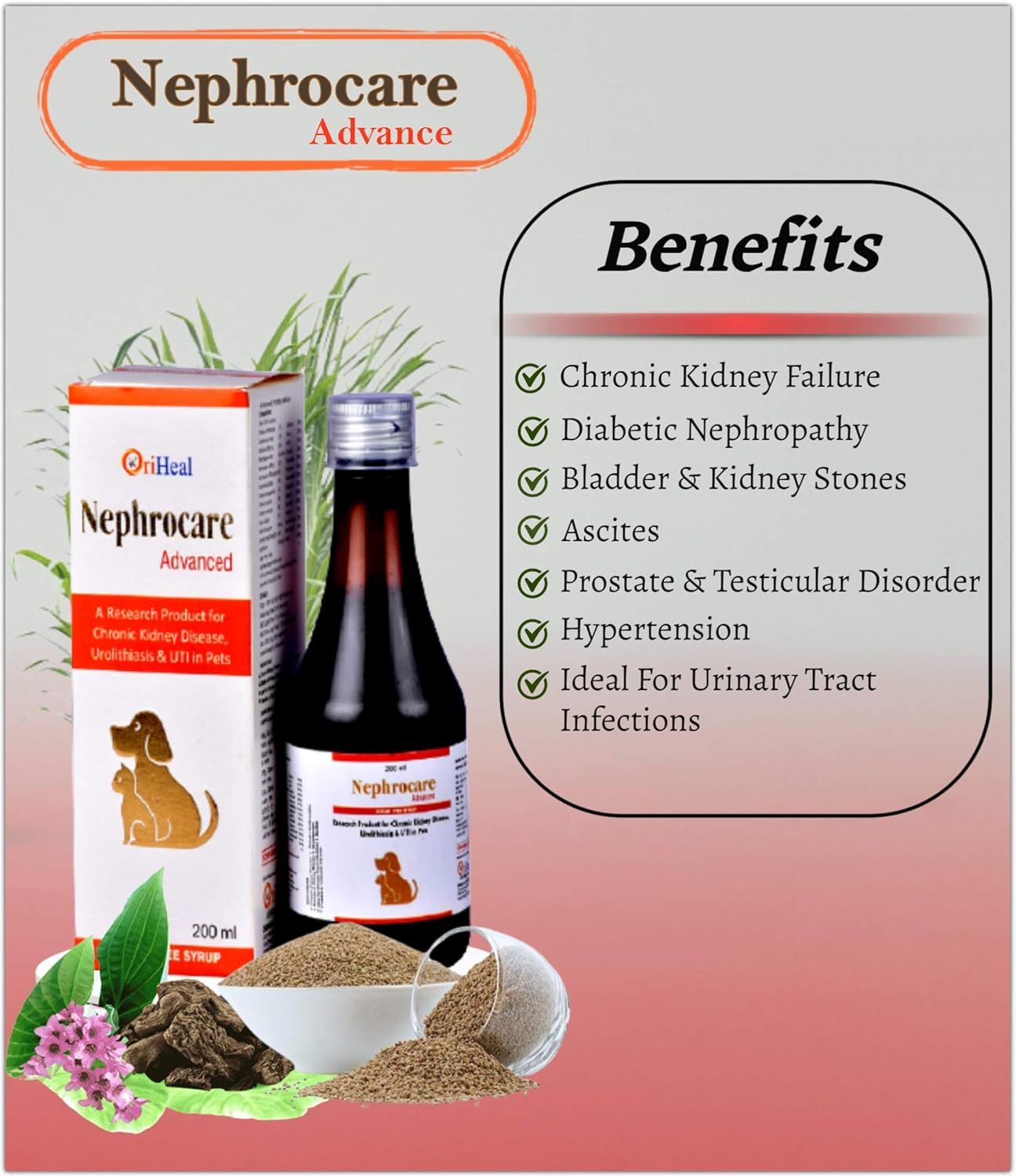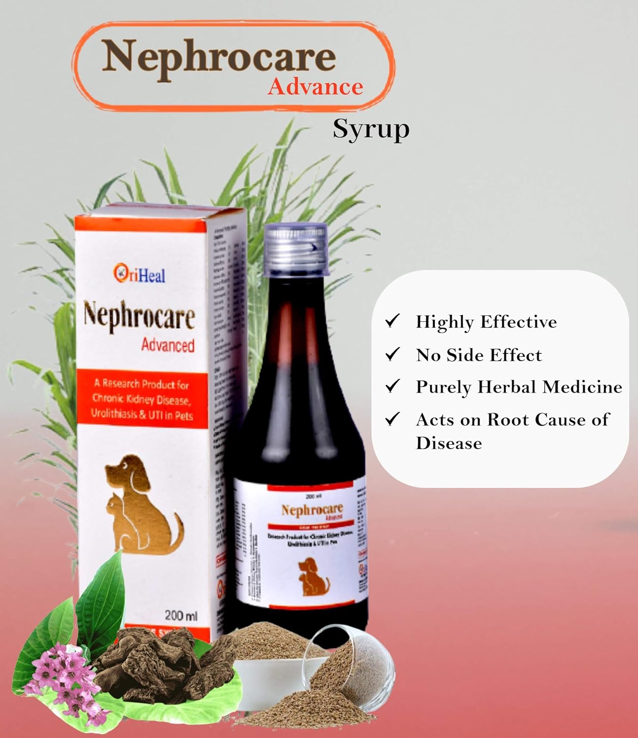 NEPHROCARE ADVANCED is an ayurvedic renal and urinary support syrup for pets. It combines 14 herbs to support kidney function, manage urinary tract infections, and prevent stone formation. It is ideal for chronic kidney disease, diabetic nephropathy, and as supportive care in hypertension and ascites.