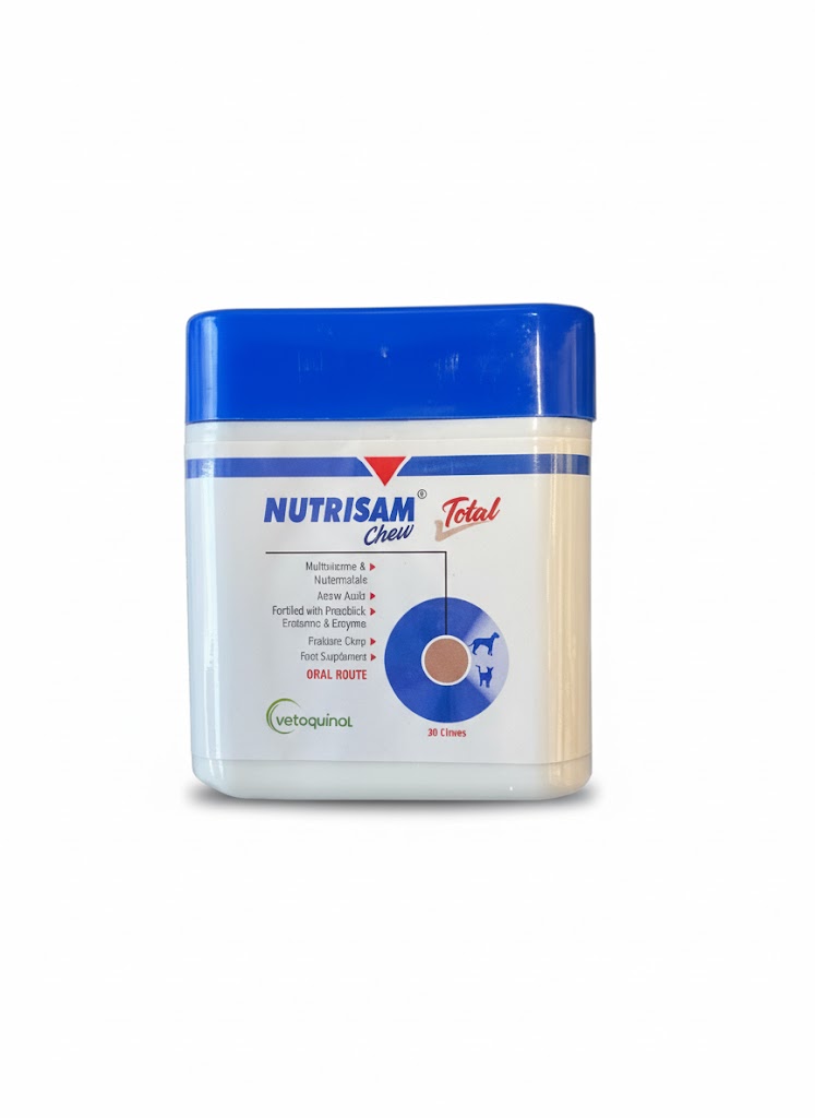Nutrisam total is a feed supplement for dogs and cats made available in palatable chew form.