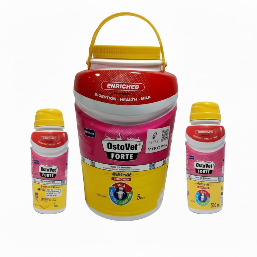 Ostovet Forte is a high-potency liquid feed supplement specially formulated for dairy cattle and other livestock. Enriched with double-strength calcium, phosphorus, Vitamin D3, Vitamin B12, peptides, carbohydrates, and organic minerals, it supports milk production, bone strength, digestion, and overall health during key physiological stages such as pregnancy, calving, and lactation. Known for its effectiveness and veterinarian trust, Ostovet Forte enhances udder health, reproductive performance, and calf development. It is safe for use in cattle, buffaloes, goats, sheep, and camels, making it a versatile and reliable choice for livestock care.