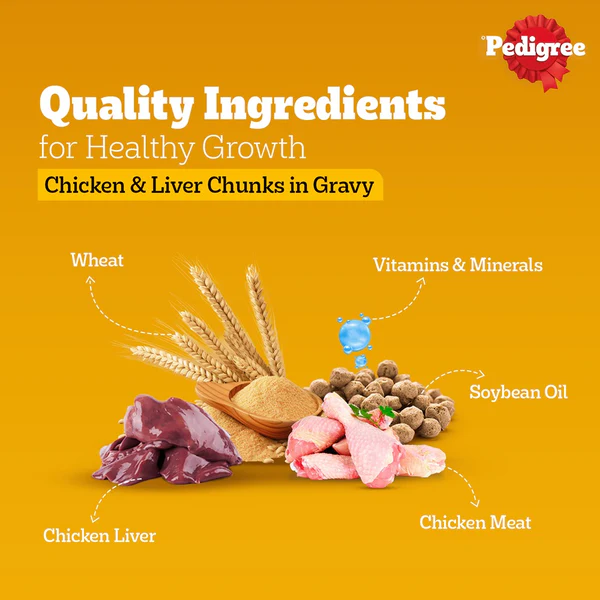 Make every mealtime a fusion of taste and nutrition for your Puppy with Pedigree. Made with real meat and high-quality protein, Pedigree Puppy Wet Dog Food, Chicken & Liver Chunks in Gravy, ensures that you are providing a meal that keeps your puppy happy and supports their well-being.