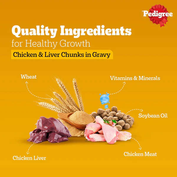 Pedigree provides complete and balanced dog food for puppies to ensure their healthy development. Pedigree Puppy Wet Dog Food, Chicken Chunks in Gravy is a wholesome meal that promotes the healthy growth of your dog