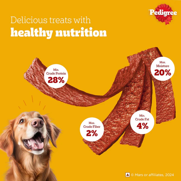 • Nutrition: Pedigree Tasty Jerky contains Omega 6 & is a high-protein* healthy treat (*20% more protein as compared to Pedigree® Ranchos Super Bones) with low fat.