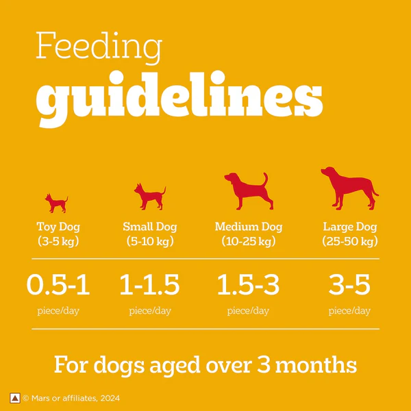 Feeding Instructions: Toy dog (3-5 kg) 0.5-1 piece/day, Small dog (5-10 kg) 1-1.5 pieces/day, Medium dog (10-25 kg) 1.5-3 pieces/day, Large dog (25-50 kg) 3-5 pieces/day. For dogs aged over 3 months Ensure your dog gets enough nutrients from the main meal. Jerky-style treats made with chicken liver cut into long, thin strips and dried.