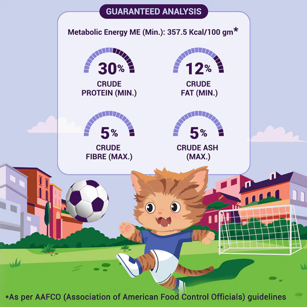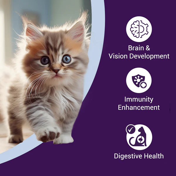 This recipe features psyllium husk, which helps control hairball formation and ensures smoother digestion. The inclusion of cranberries helps regulate urinary pH levels, promoting a healthy urinary system. EPA and DHA support optimal brain development and sharp eyesight, essential for your kitten’s growing years.