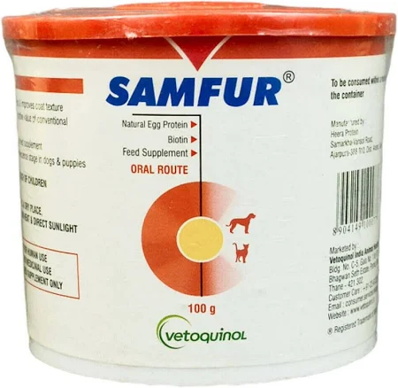 Samfur from vetoquinol helps in improving skin and fur. Reduces abnormal shedding. Promotes hair growth, and prevents hair fall due to mange infestation or dermatitis (skin swelling). Strengthened with egg protein and biotin. It is one of the best protein powders for dogs & cats available in the market.