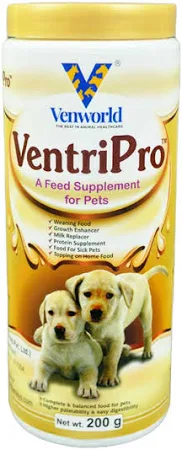 Venkys Ventripro Puppy Weaning Supplement is a specially formulated dietary supplement designed to support puppies during the critical weaning stage. It provides essential nutrients that promote healthy growth, strong immunity, and overall vitality. This supplement is easy to digest and enriched with high-quality proteins, vitamins, and minerals, making it an ideal choice for transitioning puppies from mother’s milk to solid food.