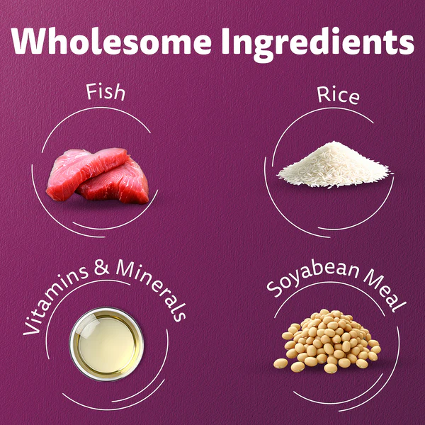 Cereals (Corn and/or Wheat and/or Rice), Poultry and Poultry By-Product, Oils, Soybean Meal, Fish Hydrolyzed, Minerals, Corn Gluten Meal, Iodized Salt, Vitamins, Amino Acids, Colouring Agents, Preservatives, Flavours.